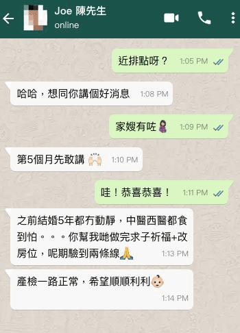 結婚5年太太一直都未能懷孕,中西醫都試到怕... 在王老師的建議下,太太終於成功懷孕,產檢一切正常,非常感恩。