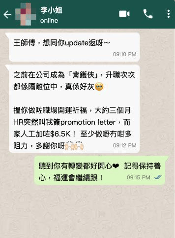 王老師幫我做左事業發展諮詢,大約三個月HR突然叫我簽promotion letter, 而家人工加左$6.5K! 做嘢都無咁多阻力。
